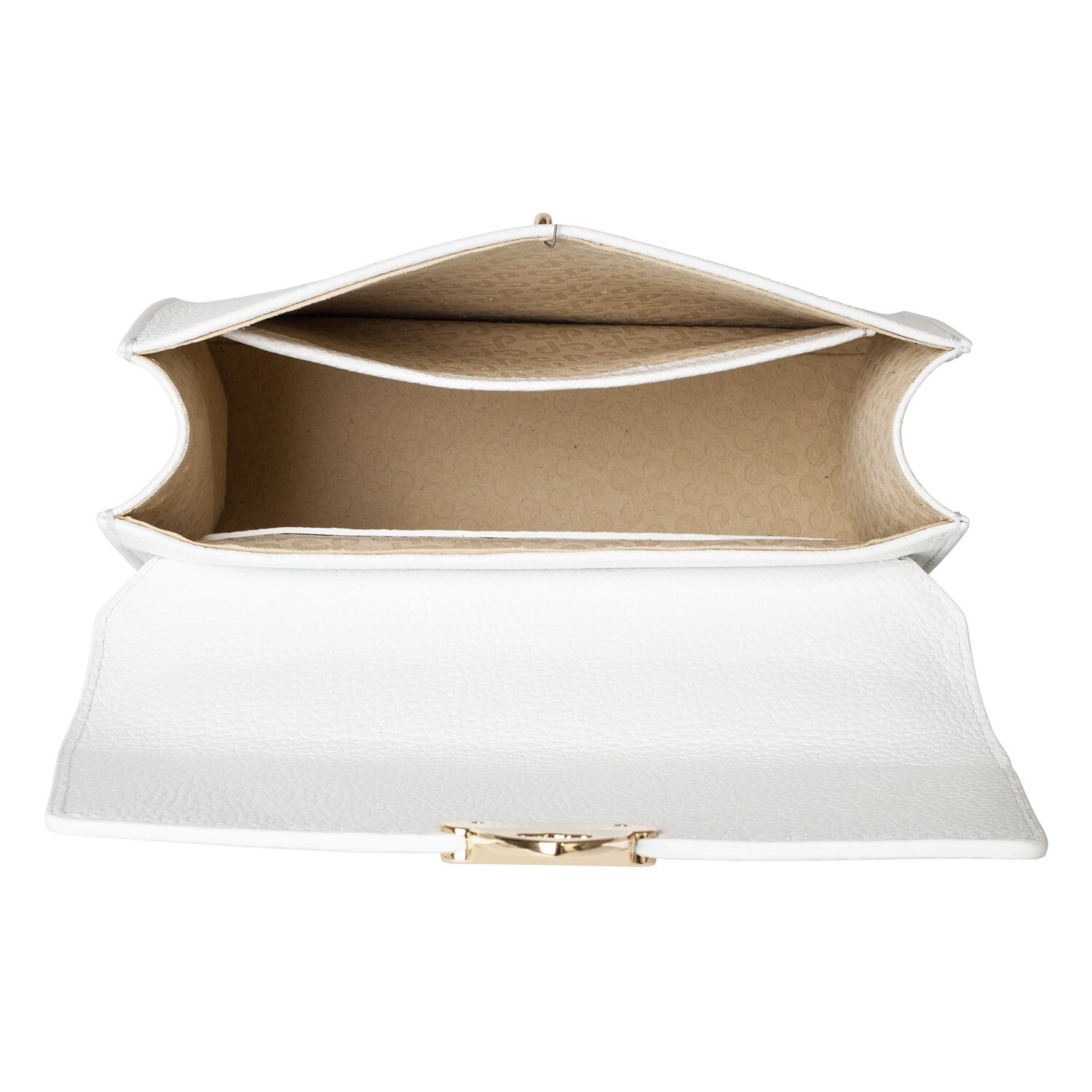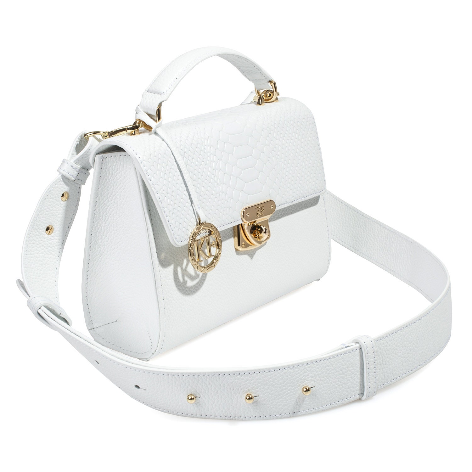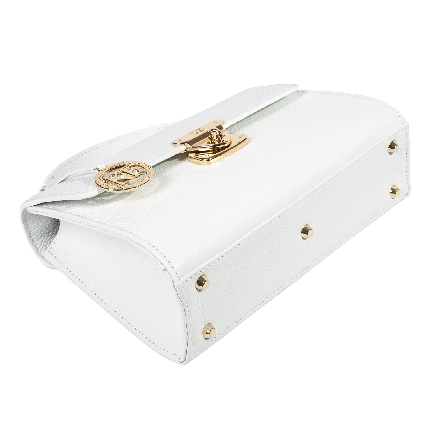 White genuine leather handbag from Ukrainian designer Katerina Fox. The internal space of a bag is equipped with three spacious compartments and two patch-pockets and one zipper pocket. One of the spacious compartments is closed with a zipper. The bag is closed with a clasp. The bottom of the bag is protected with metal legs. There is a long handle that allows you to wear the bag on the shoulder. The kit also includes a storage bag.