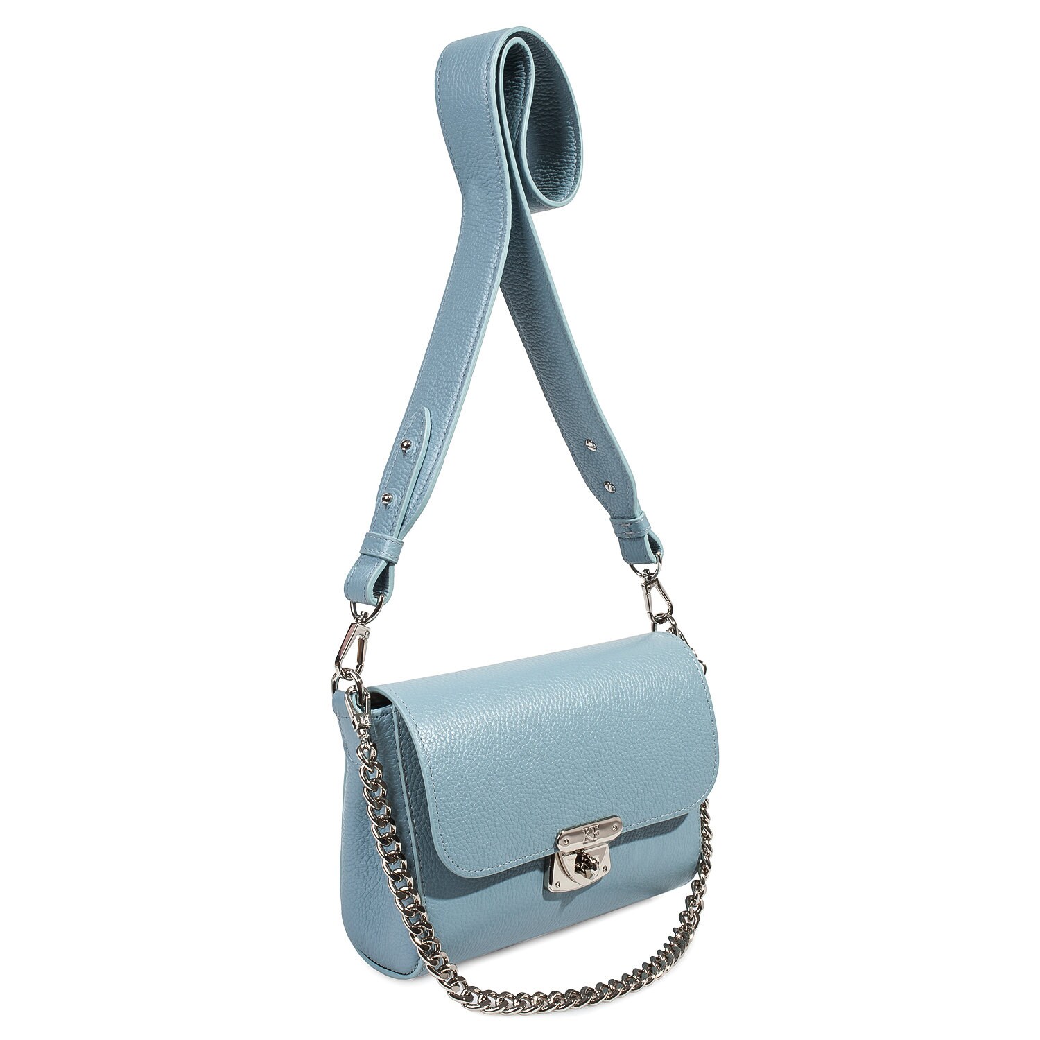 Blue genuine leather woman shoulder bag from ukrainian designer Katerina Fox. Fashionable and elegant modern bag KF for bright girls and women. This bag is able to attract attention and highlight your exquisite taste. Inside the bag is one large compartment and a convenient zippered pocket for small items, closes the bag on the clasp. The bag is comfortable to wear on the shoulder or across the shoulder.