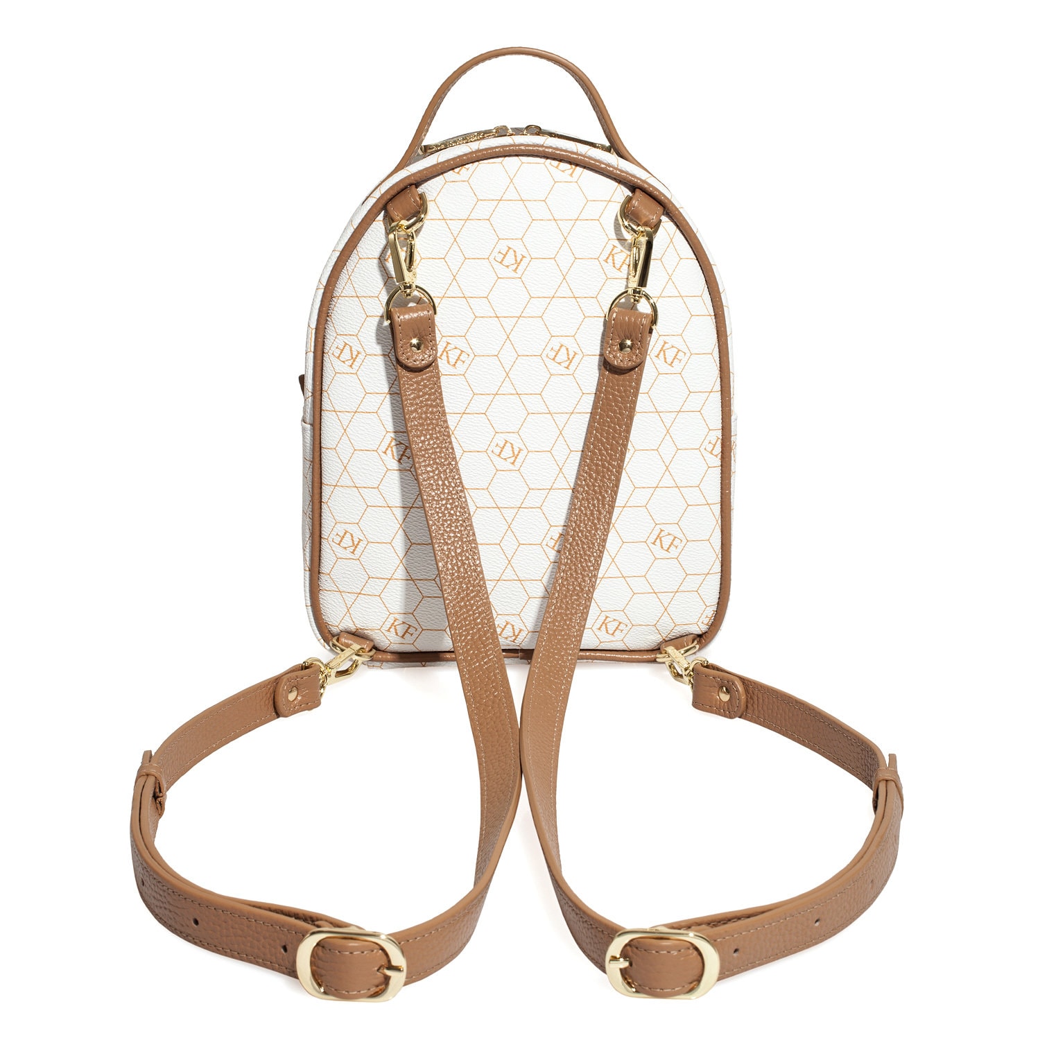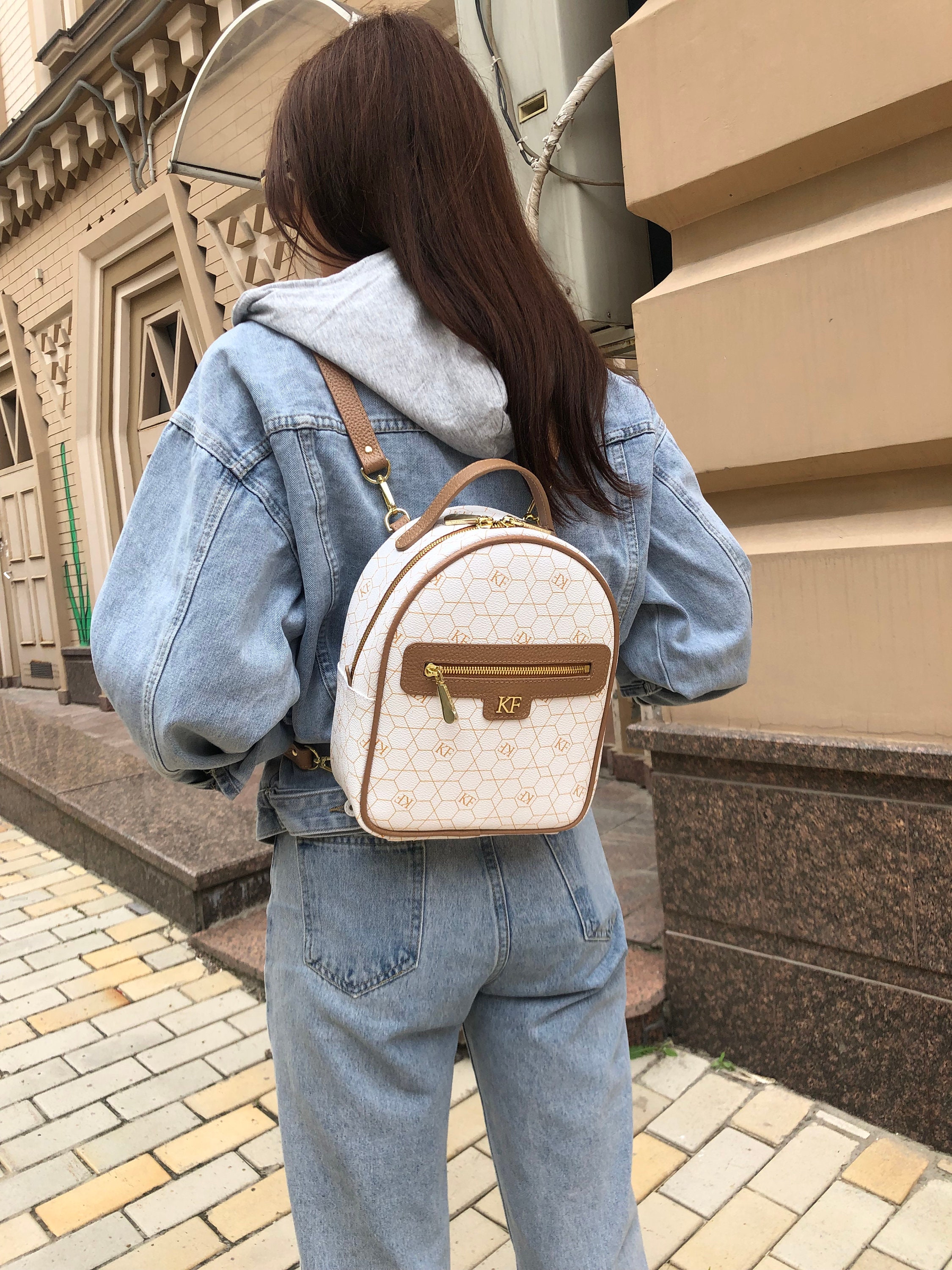 Women's backpack made of strong synthetic material (canvas). Canvas is scratch resistant and moisture resistant. Natural leather trim. Metal hardware with galvanized coating. Lining – microfiber. The inner space of the backpack is equipped as follows: one spacious compartment, two pockets: one with a zipper, the second one is a patch pocket, an outside pocket with a zipper. The backpack closes with a zipper. The set also includes a storage bag.