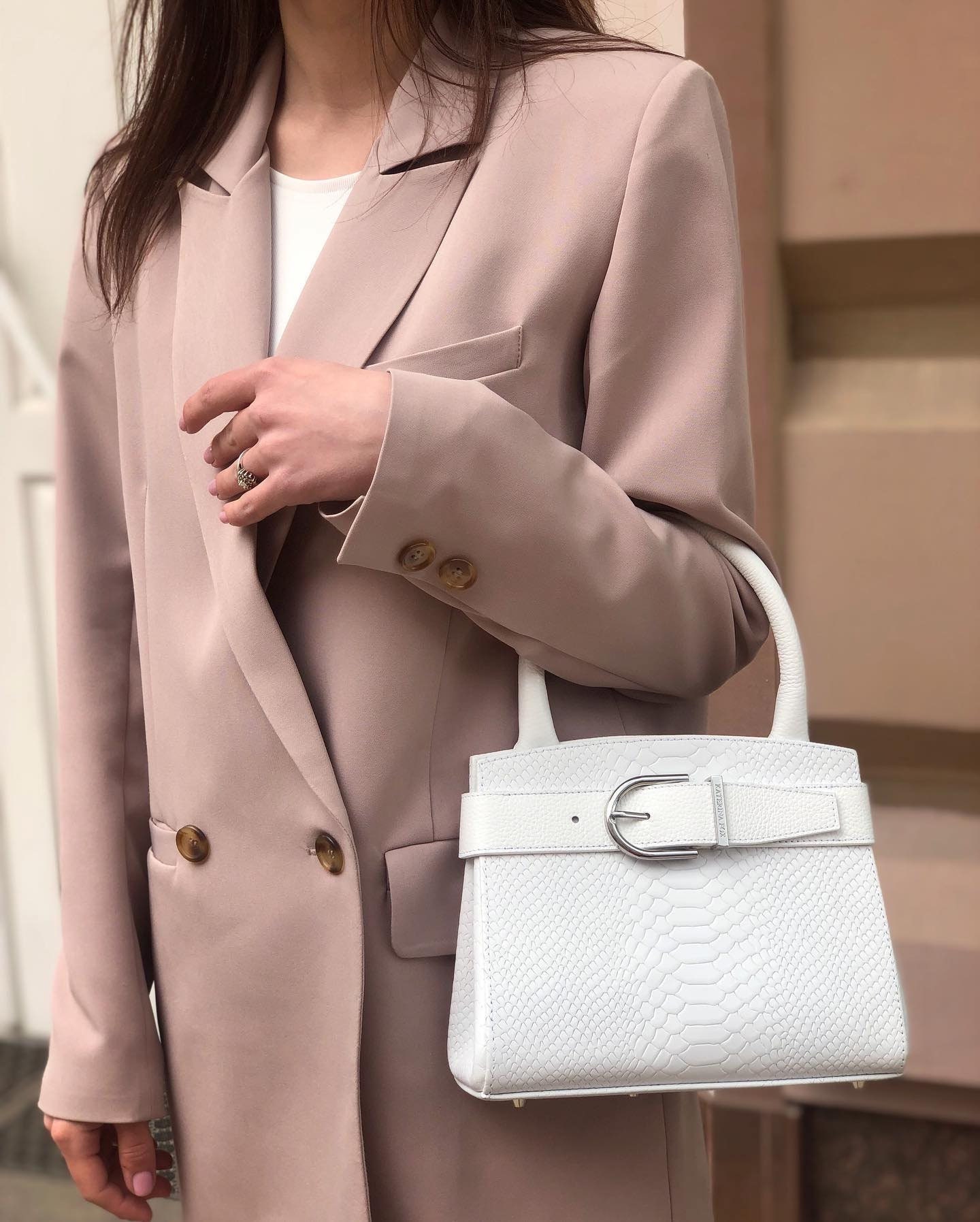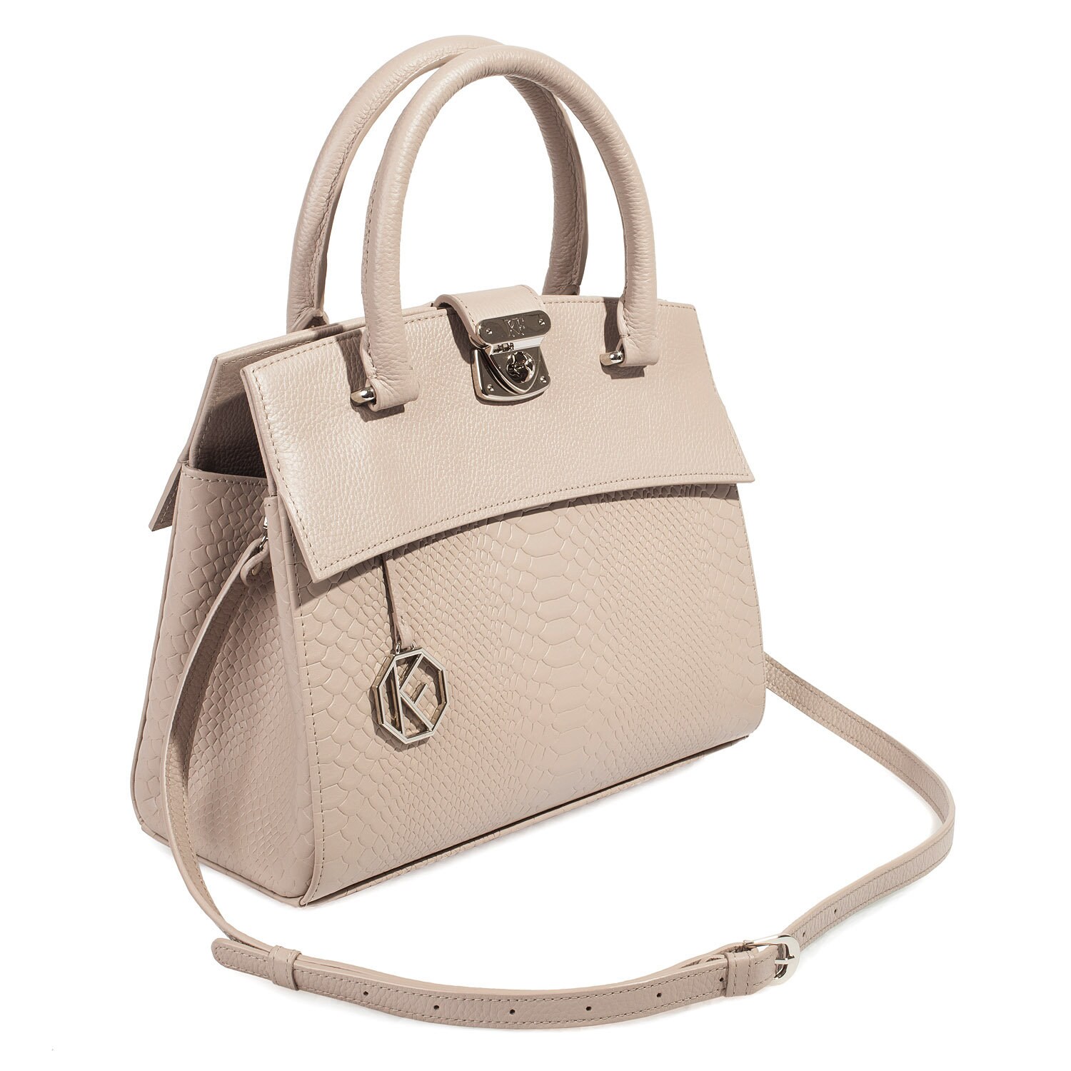 Women's leather bag made of genuine leather, hardware with galvanic coating and microfiber lining. The internal space of a bag is equipped with three spacious compartments and two patch-pockets and one zipper pocket. Closes with 2 buttons magnet. The bottom of the bag is protected with metal legs. The kit also includes a storage bag.