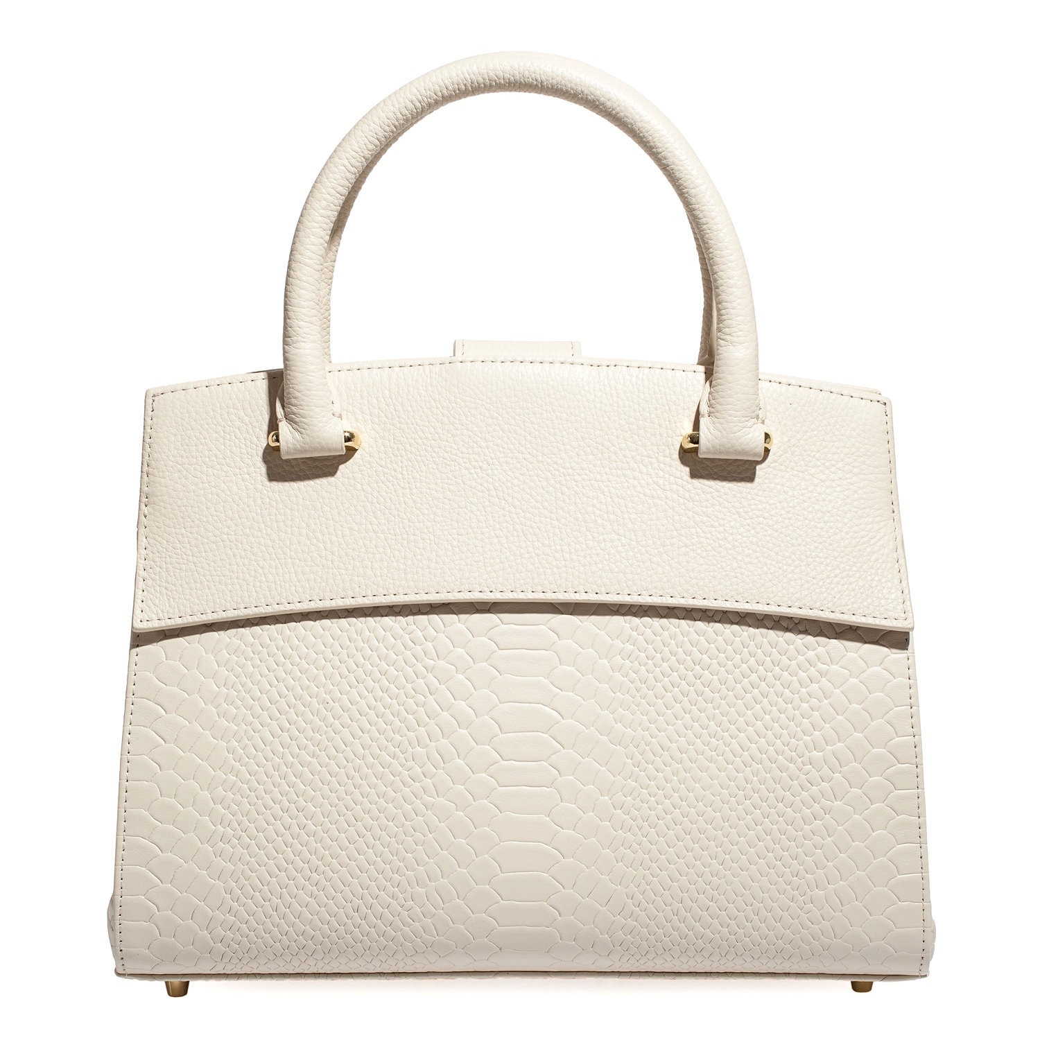 Women's leather bag made of genuine leather, hardware with galvanic coating and microfiber lining. The internal space of a bag is equipped with three compartments, two compartments and two side pockets, one of them with a zipper. It closes with a lock and two magnet buttons. The bottom of the bag is protected with metal legs. There is a long handle that allows you to wear the bag on the shoulder. The kit also includes a storage bag.
