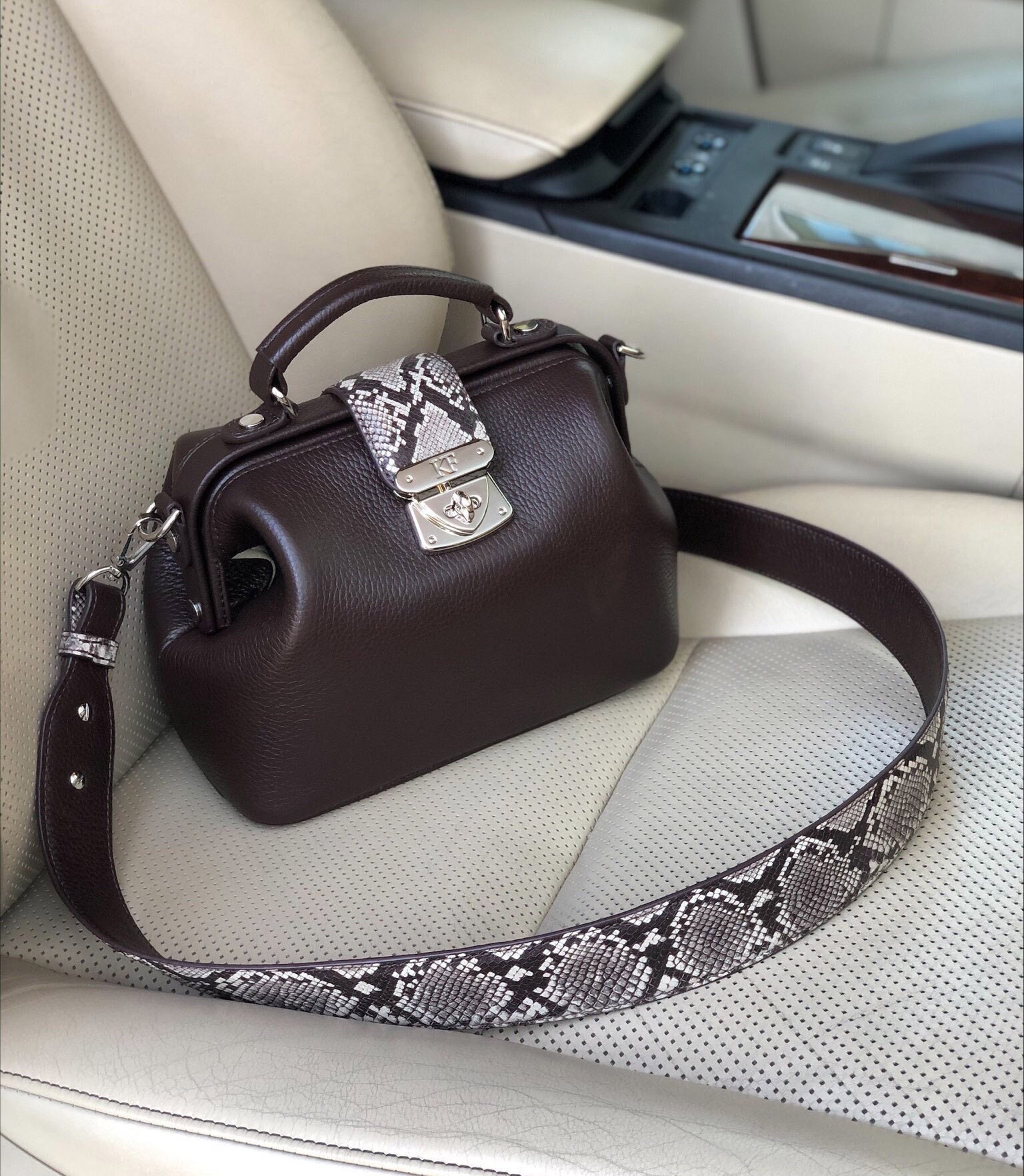 Women's leather bag made of genuine leather, hardware with galvanic coating and microfiber lining. The internal space of a bag is equipped with three compartments, one compartment and two side pockets, one with a zipper. §³loses with 3 magnet buttons. The bottom of the bag is protected with metal legs. There is a long handle that allows you to wear the bag on the shoulder. The kit also includes a storage bag.
